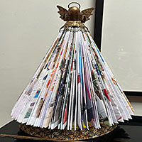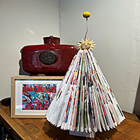 While the tree itself, especially with a star, reflects Christmas symbolism, each work is unique, with a broader emphasis on renewal. Their various bases are round, square, star or diamond shaped, some are covered in vintage wallpaper or prints of my artwork, while the tops are adorned with objects or symbols. Have a look and see what they suggest to you.