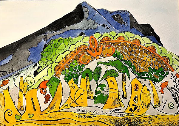 Inspiration for this series was twofold - exploration of pattern with the universal symbol of the ‘Tree of Life’. This resulted in a series of collagraphs, which were then hand painted in watercolour. Collagraphy is a very versatile printing process as it utilises a range of everyday materials for collage. The idea is to glue down a range of fabrics and materials onto a hard piece of cardboard to build a relief surface. This ‘plate’ then gets inked, and printed. Materials used include, different textured papers, gauze, string, wool, doilies, tea leaves and leaves from the studio garden.