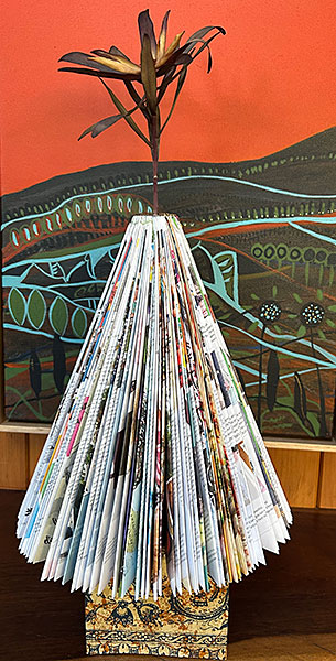 Since exploring the concept of The Tree of Life in earlier collographs, I was inspired to focus on creating something more 3-dimensional, using and revitalising found objects, and the plentiful magazines at home containing quality paper great for folding. The first to emerge from this series is 'Stories in the Press' (Bob Dylan, Idiot Wind).